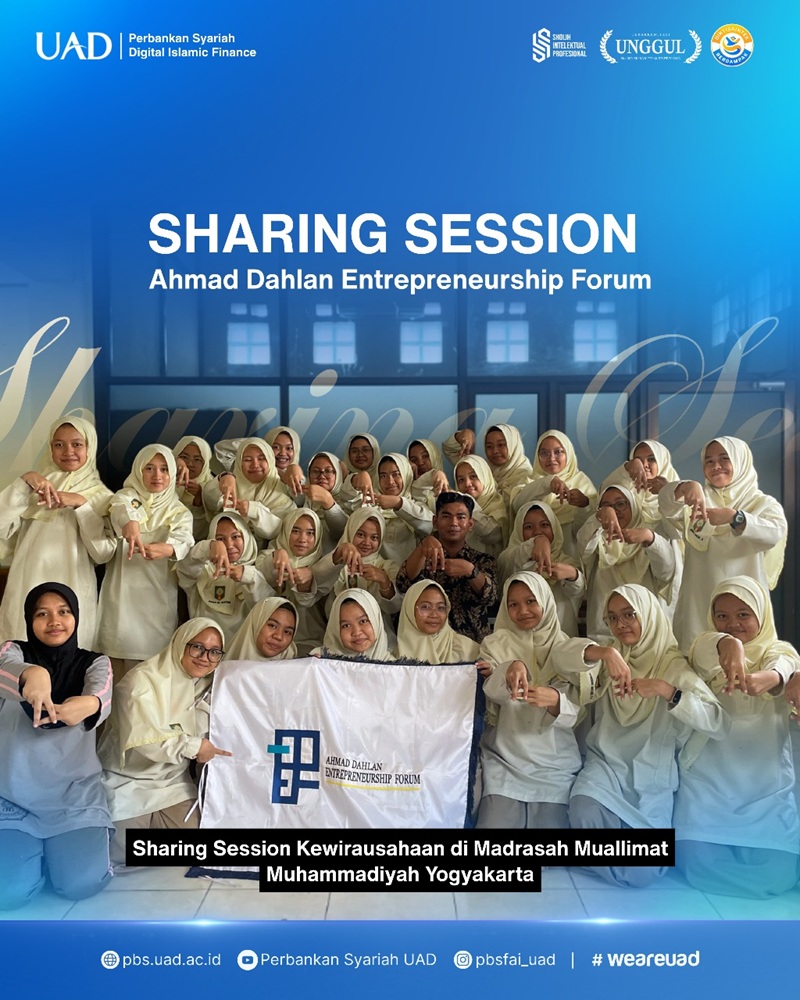 Yogyakarta – Mahasiswa Program Studi Perbankan Syariah Universitas Ahmad Dahlan (PBS UAD) yang tergabung dalam kelompok studi Ahmad Dahlan Entrepreneurship Forum (ADEF) Universitas Ahmad Dahlan menjadi narasumber dalam kegiatan sharing session pada rangkaian Sekolah Kewirausahaan dan Perencanaan Bisnis pada Rabu, 1 Oktober 2025 yang bertepatan dengan tanggal 09 Rabiul Akhir 1447 H. Acara ini bertempat di Madrasah Mu’allimaat Muhammadiyah Yogyakarta.