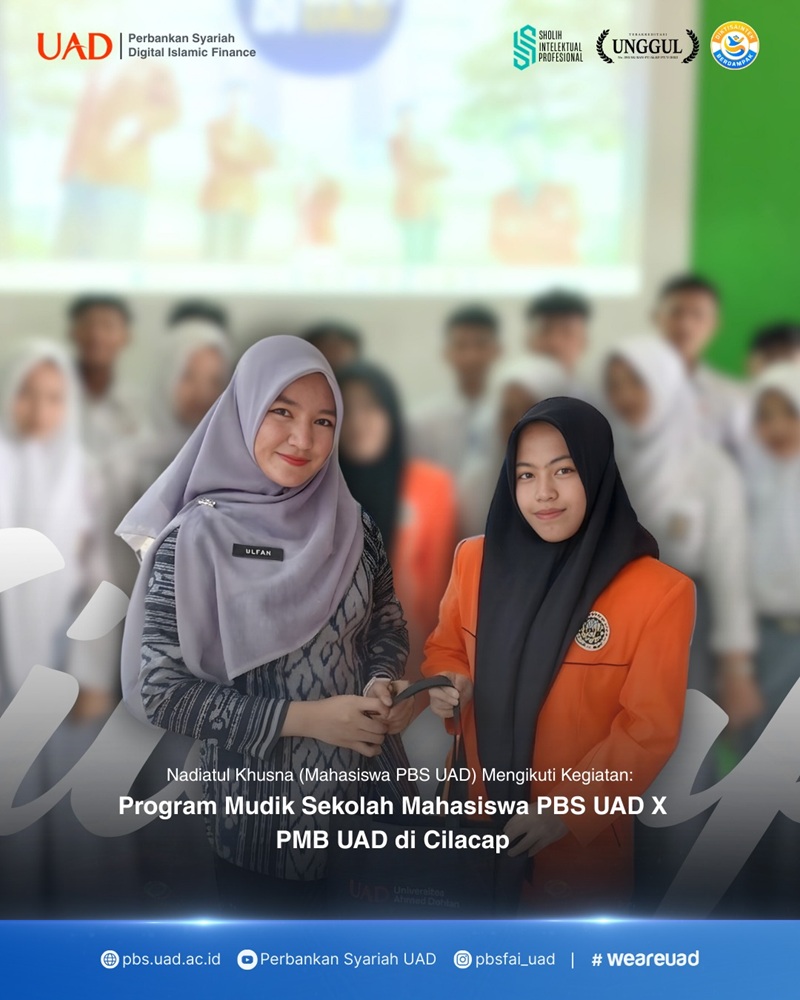 Yogyakarta – Mahasiswa Program Studi Perbankan Syariah (PBS) Universitas Ahmad Dahlan melaksanakan kegiatan kunjungan edukasi ke sejumlah sekolah menengah atas di wilayah Kabupaten Cilacap, Jawa Tengah. Kegiatan ini dilakukan oleh Nadia Khusna, mahasiswa PBS UAD angkatan 2024, sebagai bentuk kontribusi nyata dalam memberikan wawasan pendidikan tinggi kepada para pelajar. Dalam kunjungan tersebut, Nadia mengunjungi dua sekolah, yaitu SMA PGRI 4 Gandrungmangu dan SMA Muhammadiyah Kedungreja. Kegiatan yang dilaksanakan berupa sosialisasi pendidikan tinggi, pengenalan dunia perkuliahan, serta pemaparan mengenai peluang studi di bidang ekonomi dan perbankan syariah.