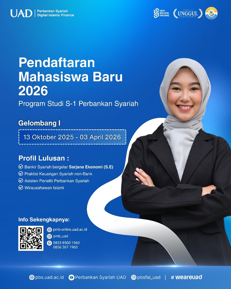 Dengan diterimanya mahasiswa baru Tahun Akademik 2026/2027, Prodi PBS UAD berharap mampu melahirkan lulusan yang tidak hanya unggul secara akademik, tetapi juga memiliki komitmen moral dan etika dalam mengembangkan sistem perbankan dan keuangan syariah yang adil dan berkelanjutan. (PBS)