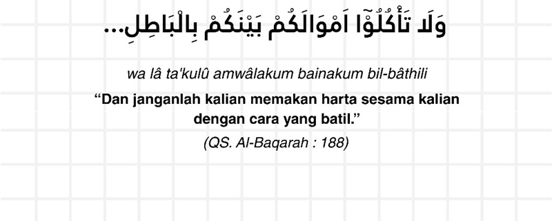 Yogyakarta – Artinya “Dan janganlah sebagian kamu memakan harta sebagian yang lain dengan jalan yang batil dan (janganlah) kamu membawa (urusan) harta itu kepada hakim supaya kamu dapat memakan sebagian daripada harta orang lain itu dengan (jalan berbuat) dosa, padahal kamu mengetahui.” (QS. Al-Baqarah: 188)